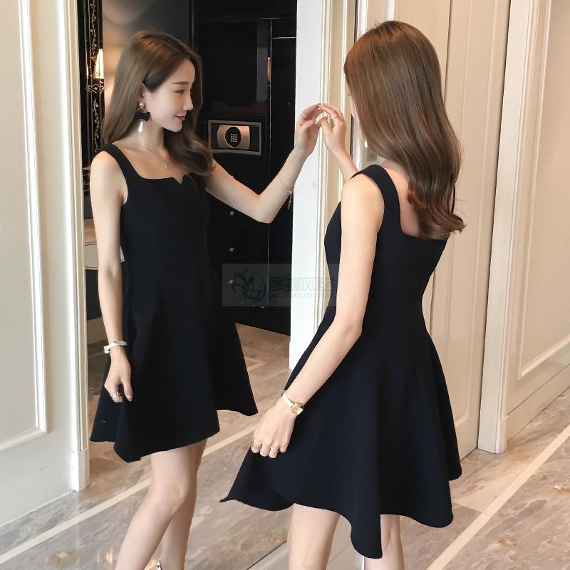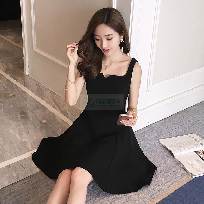 2018春夏新款高腰赫本小黑裙性感吊带背心连衣裙小v领气质短...