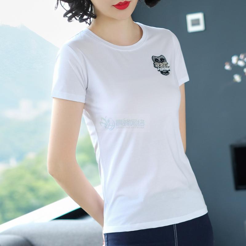 英曼妃2018春夏装新款猫头鹰钉珠t恤女短袖修身纯棉白色打底...