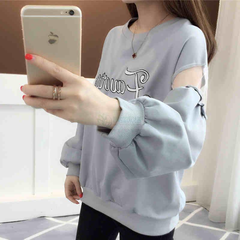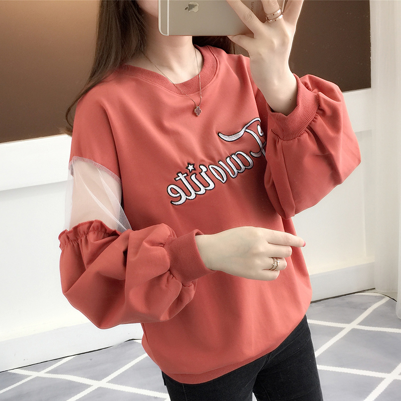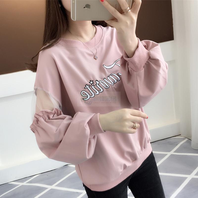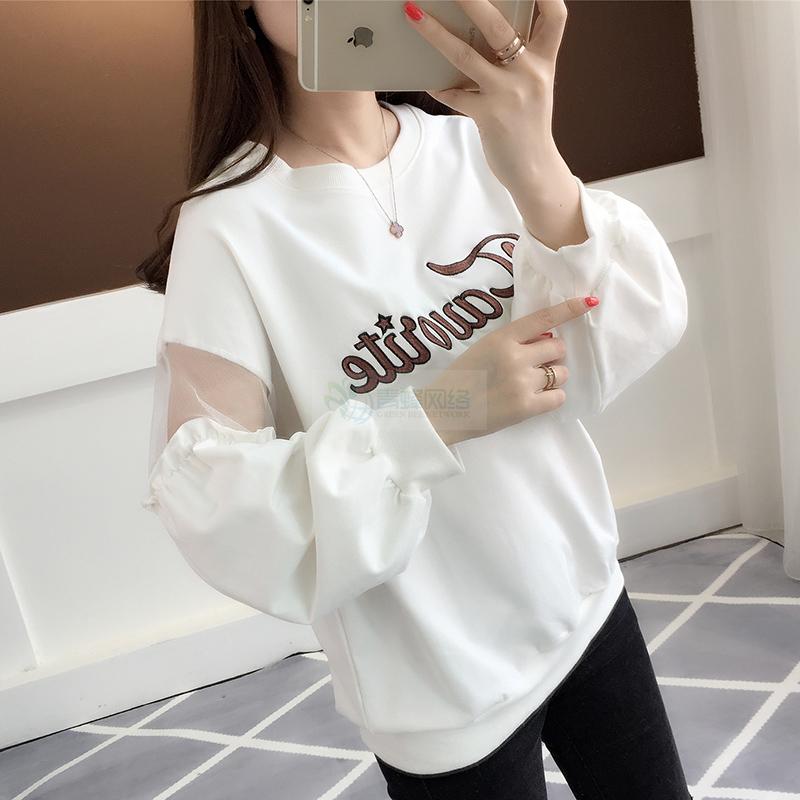 春装新款卫衣 韩版女装网纱拼接长袖T恤圆领字母印花套头上衣潮...