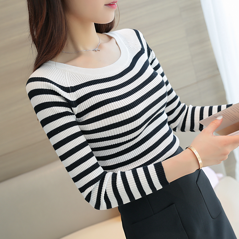 2018春秋新款韩版女装紧身打底衫修身一字领针织衫短款套头薄...