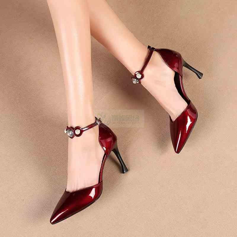 包头凉鞋女细跟2018春季新款性感一字搭扣中空真皮水钻尖头高...