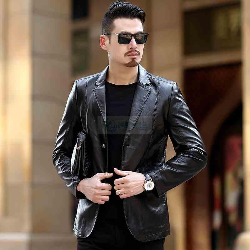 春季新款男士商务皮夹克薄款pu皮衣男时尚休闲中年西服领皮外套...